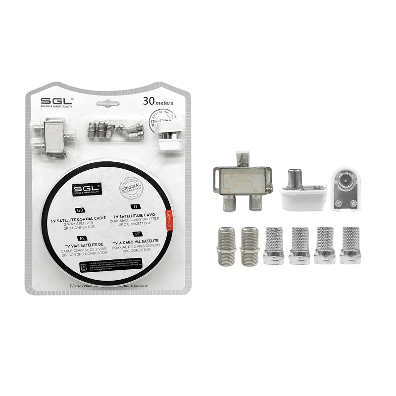 Σετ σύνδεσης κεραίας τηλεόρασης με καλώδιο μήκους 30m και διακλαδωτή 2 εξόδων. Χρώμα: Λευκό.