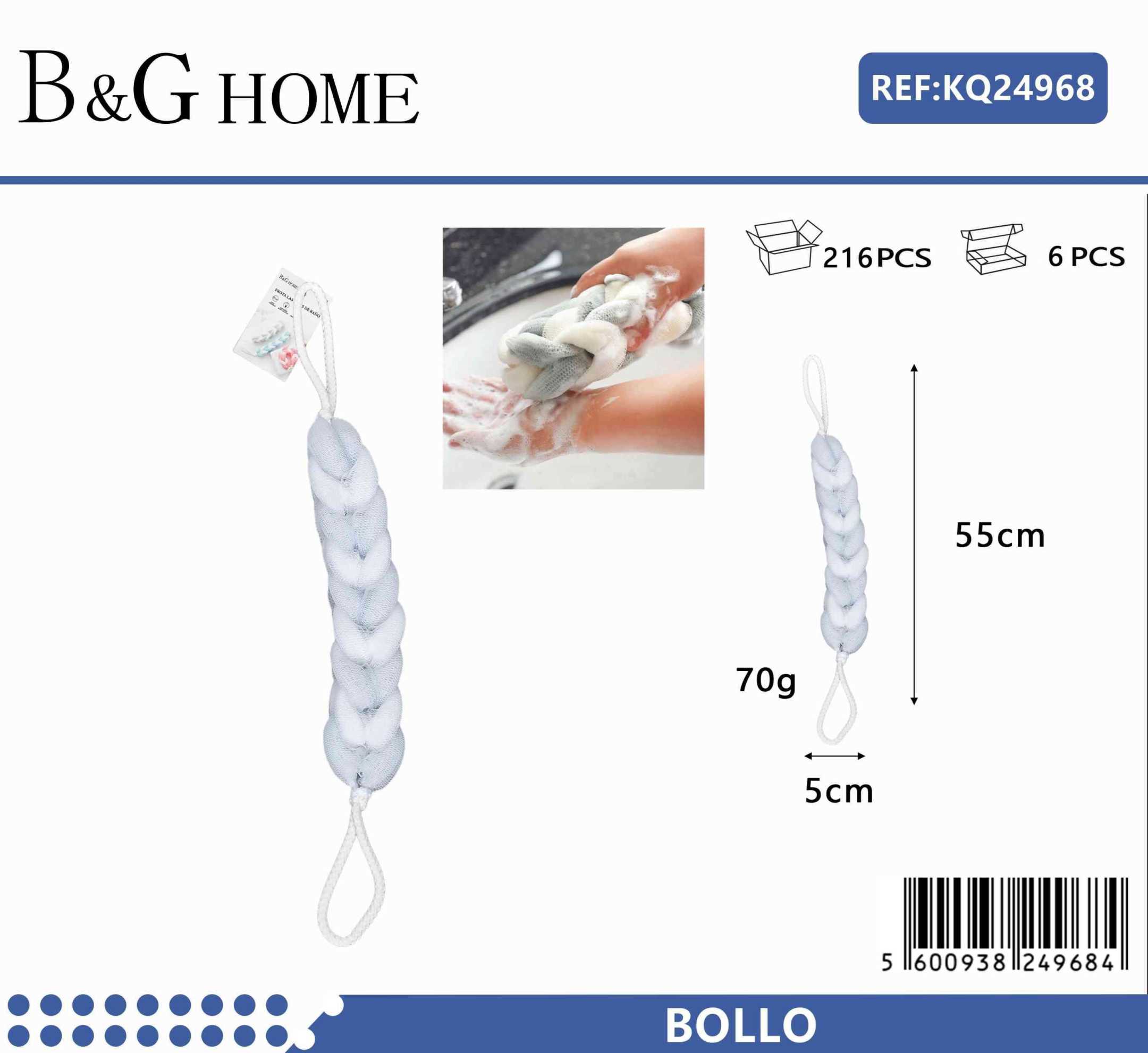 Σφουγγάρι μπάνιου δίχτυ από υψηλής ποιότητας και ανθεκτικότητας νάιλον, με κορδόνι-κρεμάστρα, εργονομικά σχεδιασμένο για την πλάτη χάρη στο ειδικό σχήμα πλεξούδα και τις λαβές του.